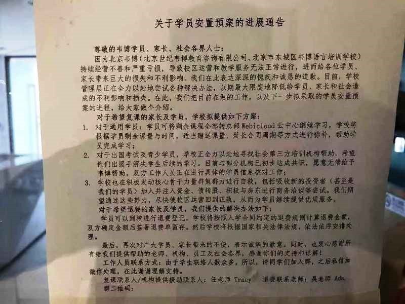 记者注意到,韦博英语北京分公司贴出了学员安置预案进展通告,一是可以转到线上学习,二是正在寻找第三方培训机构帮忙接收学员,三是呼吁骨干力量进行自救,包括吸收新的投资者(甚至是学员)加入并注入资金等。记者注意到,通告下面留的二维码已经无效。