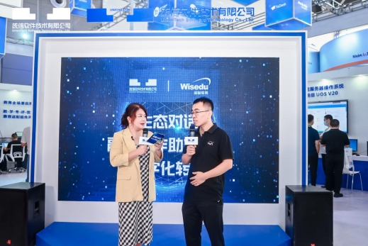 在展会现场,来自统信教育的公关总监谢丽娜分别与金智、金山、数科、锐捷、e签宝、竞业达、噢易云、正元智慧、极域等厂商代表就合作现状、未来愿景等进行了现场交流。