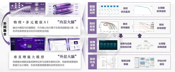 梁惠施认为,当前以大数据、大模型为代表的人工智能技术,为破解上述难题提供了全新思路。人工智能凭借其非线性特征提取能力,可深度挖掘时序关联,捕捉传统监测手段难以识别的电池早期复杂多维参数模式异常,实现“早预警”;同时,通过“数据驱动+物理机理”双驱动,可弥补纯机理模型在现场动态复杂工况与高噪声下的拟合局限,实现故障的“早诊断”;此外,通过深度融合垂直领域增强大模型和智能体架构,可基于诊断结果智能生成运维策略,落实故障“早处置”。将人工智能引入储能安全防控领域,能够将储能安全系统从一个“死板的报警器”,进化成一个“会思考的专家大脑”。