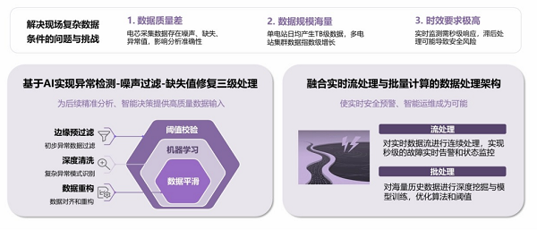 2)海量数据实时智能融合与处理架构:面对现场数据质量差、实时性要求高的挑战,构建了基于AI的“异常检测-噪声过滤-缺失值修复”三级治理机制,以及“实时流处理+批量计算”融合架构,对现场海量数据进行高效批量治理,实现TB级数据的实时预警与深度挖掘。