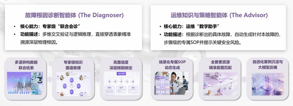 5)多智能体协同的智能运维闭环:构建“诊断-策略-交互”多智能体协同架构。其中,故障根因诊断智能体具备专家级“联合会诊”能力,通过多维验证与逻辑推理,穿透表象直达深层物理根因;运维知识与策略智能体作为“数字助手”,可依据具体故障诊断结果自主生成步骤级的专属SOP并提示风险。该智能体协同架构可实现从故障精准溯源到自动生成处置方案及评估报告的完整闭环,驱动运维从“人工响应”转向“智能决策”。