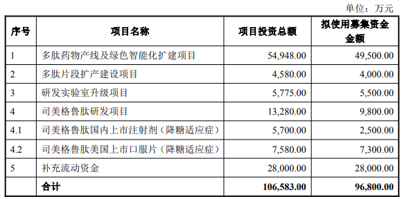 翰宇药业昨晚披露的2025年度向特定对象发行A股股票预案显示,公司本次发行募集资金总额不超过人民币96,800.00万元(含本数),在扣除相关发行费用后的募集资金净额将全部用于以下项目:多肽药物产线及绿色智能化扩建项目、多肽片段扩产建设项目、研发实验室升级项目、司美格鲁肽研发项目和补充流动资金。