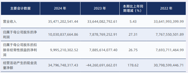 2024年,公司实现营业收入354.71亿元,同比增长5.43%;归属于母公司股东的净利润100.31亿元,同比增长27.31%;归属于母公司股东的扣除非经常性损益的净利润99.95亿元,同比增长26.75%。