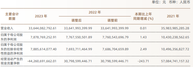 2023年,公司实现营业收入336.44亿元,同比增长0.01%;归属于母公司股东的净利润78.79亿元,同比增长1.43%;归属于母公司股东的扣除非经常性损益的净利润78.86亿元,同比增长2.49%。