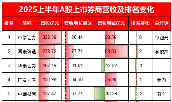 上半年,国泰海通、广发证券分别实现营业收入238.72亿元、153.98亿元,反超中国银河证券。