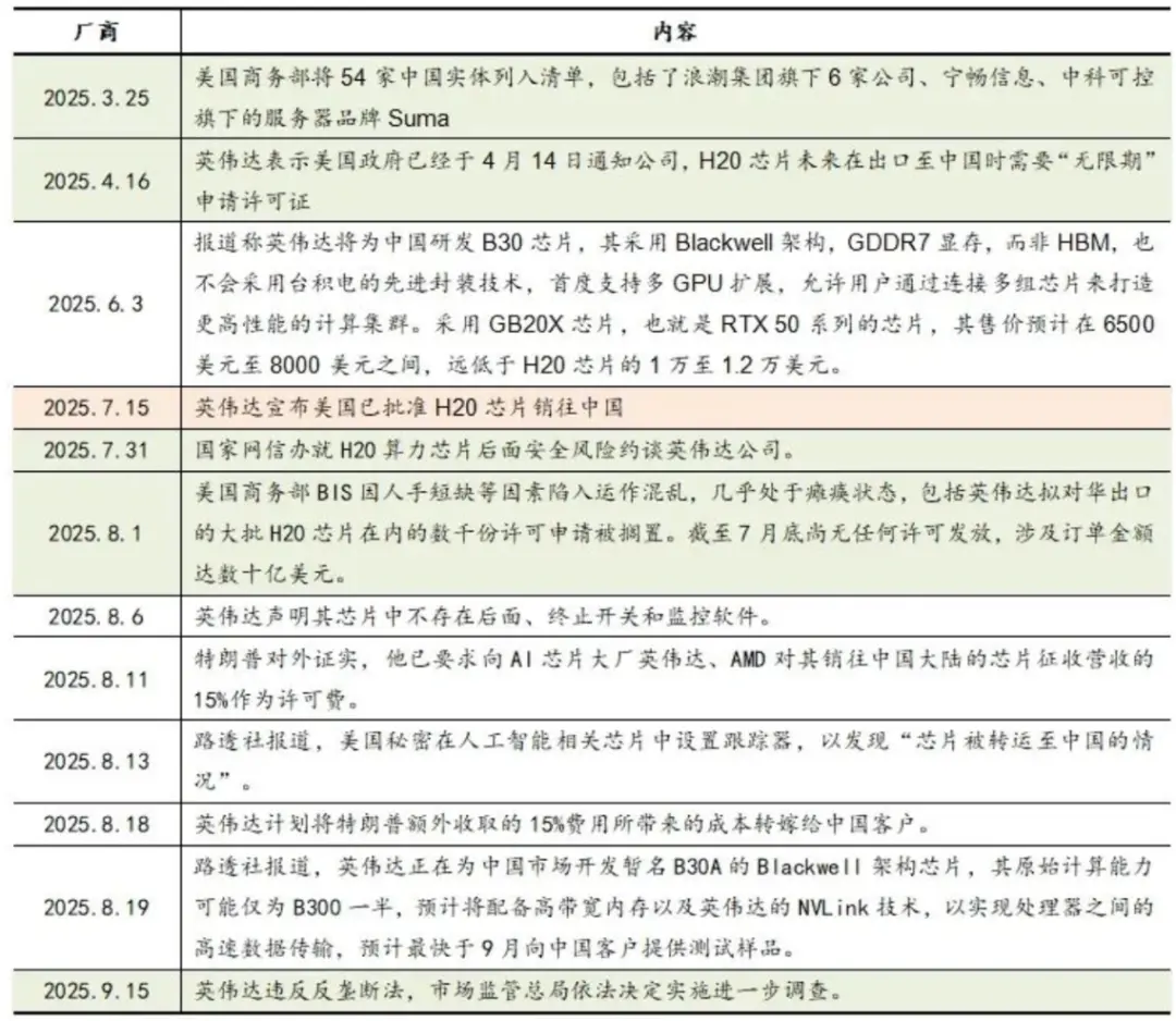 今年4月,美国政府一度禁止英伟达向中国销售H20芯片,尽管7月恢复出口,却附加了15%的收入上缴条件。面对美国的限制,中国的反制也接连升级:7月底H20被曝“漏洞后门”遭到约谈,8月中旬一度传出停产消息,而近期的反倾销调查更是将这场风波推向高潮。