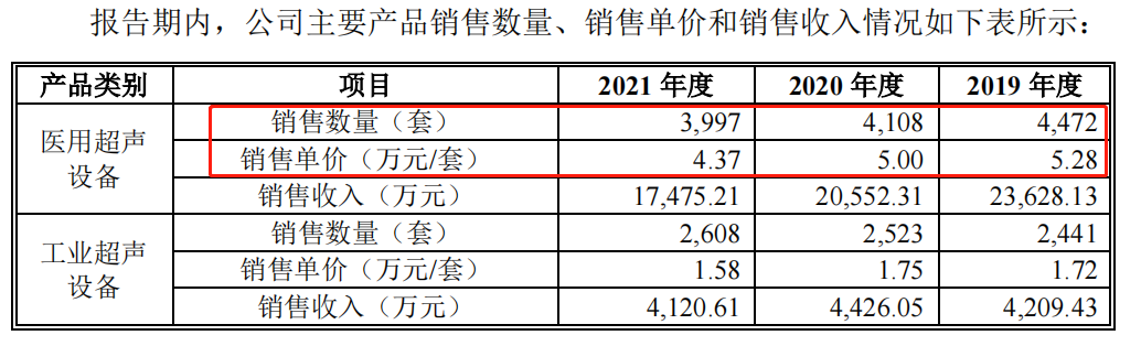 不过,汕头超声收入占比最高的产品“医用超声设备”在报告期内出现量价齐跌。报告期内,医用超声设备的销售数量分别为4472套、4108套和3997套,销售单价分别为5.28万元/套、5万元/套和4.37万元/套,均呈逐年下降的趋势。