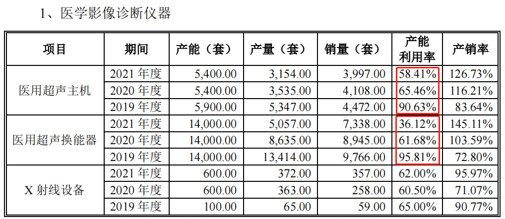 对于产能及产能利用率的变动,汕头超声表示,“2020年超声主机产能变化系将一部分产能调整至X射线设备产能;2020-2021年,受新冠肺炎疫情因素影响,并为了逐步降低公司存货规模,公司医用超声产品产量有所降低,产能利用率有所下降”。