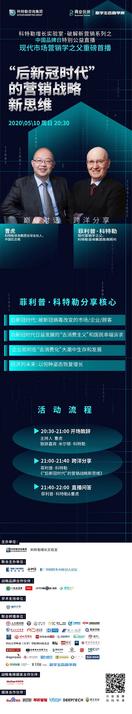 “现代营销学之父”菲利普·科特勒跨洋分享营销战略新思维与科特勒咨询集团全球合伙人、中国区总裁曹虎巅峰对话、直播互动直播主题: