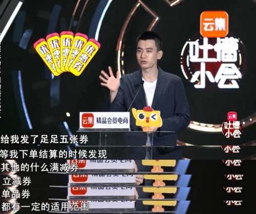 近日,来自网络综艺节目《吐槽大会》的三位脱口秀演员李诞、王建国、庞博以及云集会员代表、员工代表齐齐登上会员电商云集(NASDAQ:YJ)举办的“吐槽小会”,针对云集的带货模式、商品太少、物流太慢、刚下完单商品就降价、优惠券太复杂等话题进行犀利而幽默的吐槽,现场爆笑段子横飞。