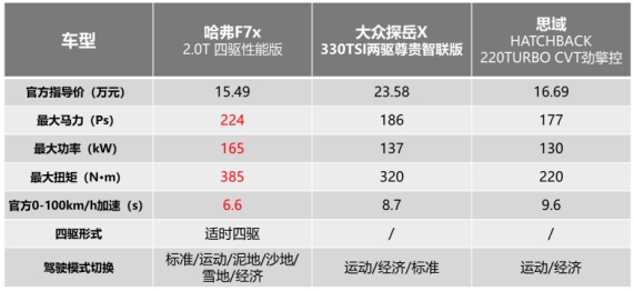 从上表可看到,哈弗F7x最大功率达165kW,在1800-3600转时,即可达到385N•m的最大扭矩,爆发力更强,起步更迅猛,可以说以压倒性优势领先大众探岳X和本田思域。在加速性能上,哈弗F7x也是三车中百公里加速最快的车型,官方零百加速仅为6.6秒,这样的成绩在2.0GDIT量产车型中绝对一流,远超大众探岳X和本田思域的8.7秒、9.6秒。