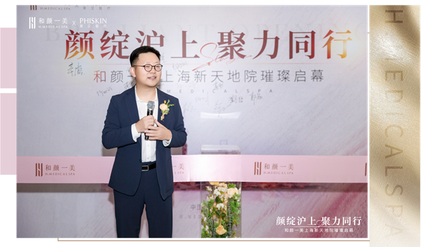 张伍新先生在致辞中深情回顾了和颜一美品牌的发展历程。八年前,和颜一美怀揣着对医美行业的敬畏与初心,种下了“美”的种子,历经数年耕耘,和颜一美上海首院正式落成,这是品牌在全国战略布局中至关重要的一步,上海新天地院的开业,其意义远不止于地域范围的拓展,它更是和颜一美对“美不远人”这一品牌口号的生动诠释,是和颜一美对医美行业初心的不忘坚守与切实践行。期待和颜一美上海新天地院能成为上海美丽事业的璀璨名片,为医美行业注入全新活力与积极能量,同时希望能够与上海的同行们相互学习、相互交流,共同推动医美行业的健康发展,让更多的人能够安全、放心地追求美丽。