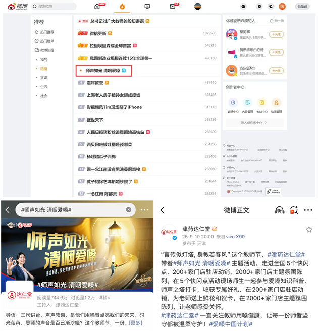 活动前期,达仁堂清咽滴丸以微博为核心传播矩阵,官方账号率先发起#师声如光,清咽爱嗓#话题,号召网友分享那些年老师给予自己力量的经典教诲。“分数只是路标,不是终点”“每天努力一点点,就比昨天有进步”等饱含温度的师者话语,迅速唤醒大众的校园记忆与感恩之情。
