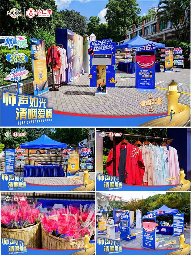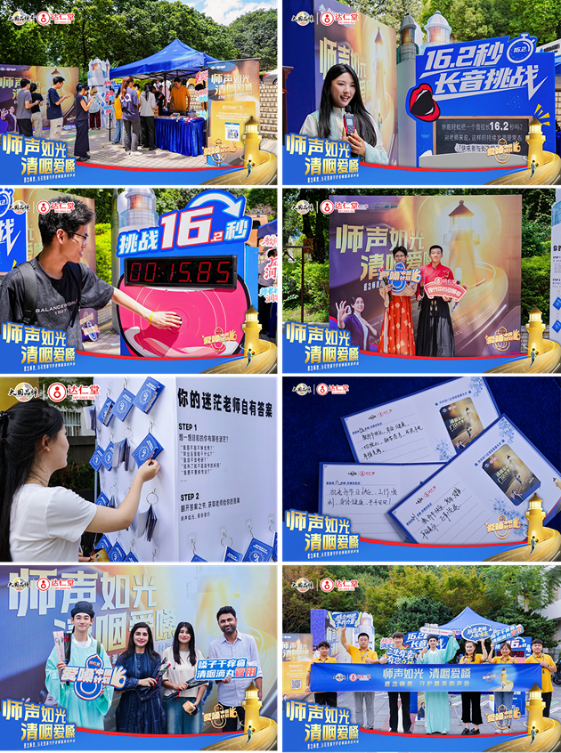 活动现场设置多重沉浸式互动体验区:“古装拍照区” 让师生穿越时空感受文化韵味;“师声之塔打卡区”成为校园里的“暖心地标”,“答案之书”汇集老师日常语录,为学生解答成长困惑;“16.2秒长音挑战” 通过趣味互动让大家直观感受老师的用嗓负担;“16.2秒起效挑战”让大家感受清咽滴丸的快速起效,同时,向学生普及达仁堂清咽滴丸的专业护嗓价值。凡参与互动的师生均可获得定制爱嗓礼包,实用的护嗓产品与趣味体验相结合,让护嗓知识深入人心。据统计,5 场高校快闪累计吸引超万名师生参与,成为校园内最具人气的教师节活动之一。