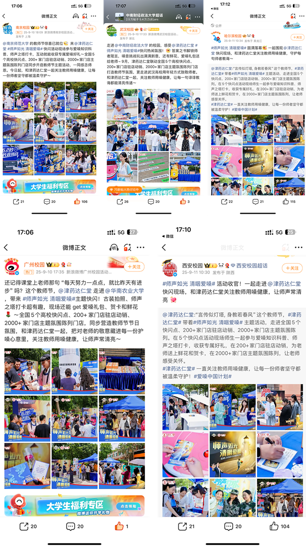五城校园号KOL助力官微话题,进一步提升“师声如光,清咽爱嗓”在微博上的话题热度,形成声势,让更多人看到并感受到津药达仁堂举办“师声如光,清咽爱嗓”快闪活动的温度。