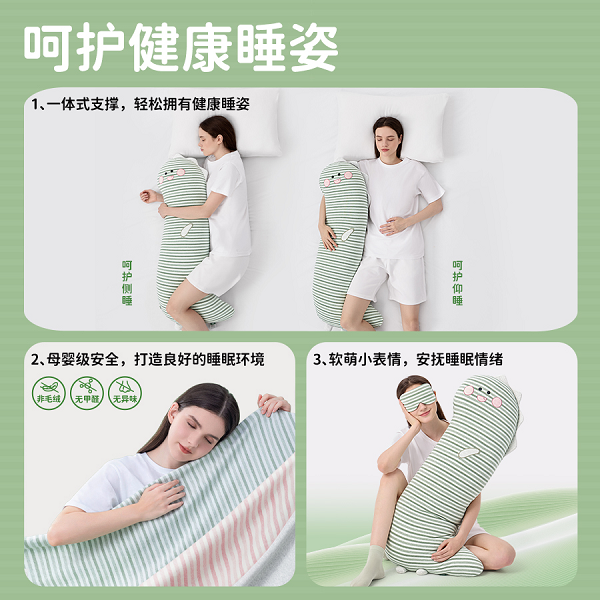 乐瓜睡觉抱枕(Sleeping Body Pillow)以软萌治愈系表情与柔滑触感,为用户提供睡前情绪安抚。研究表明,拥抱动作可刺激催产素分泌,缓解焦虑与孤独感,因此,睡觉抱枕这类单品尤其适合独居青年、高压职场人群等。它不止是一件床品,更是一位夜间“安心搭子”,帮助用户放松情绪、加快入睡,真正实现身心共护的健康睡眠。