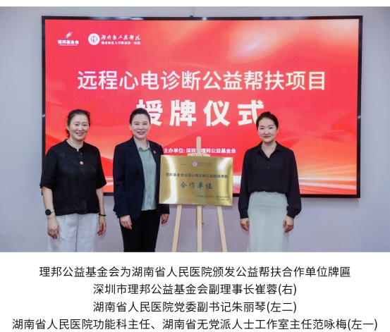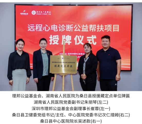 近日,理邦公益基金会远程心电诊断公益帮扶项目于湖南省人民医院举行授牌仪式,该公益项目联合湖南省人民医院的专业力量,向西藏桑日县中心医院(桑日县卫生服务中心)捐赠远程心电诊断服务,实现优质医疗资源向西藏边远地区的“直达”与“深植”,切实帮助提升藏区心血管疾病的早期筛查和救治能力。