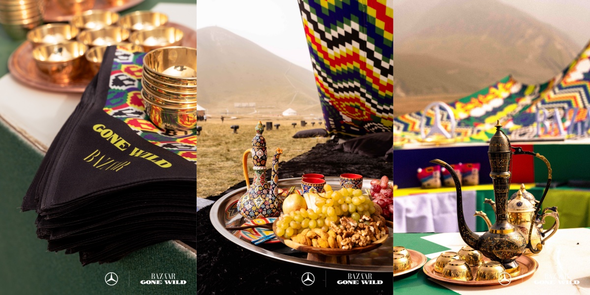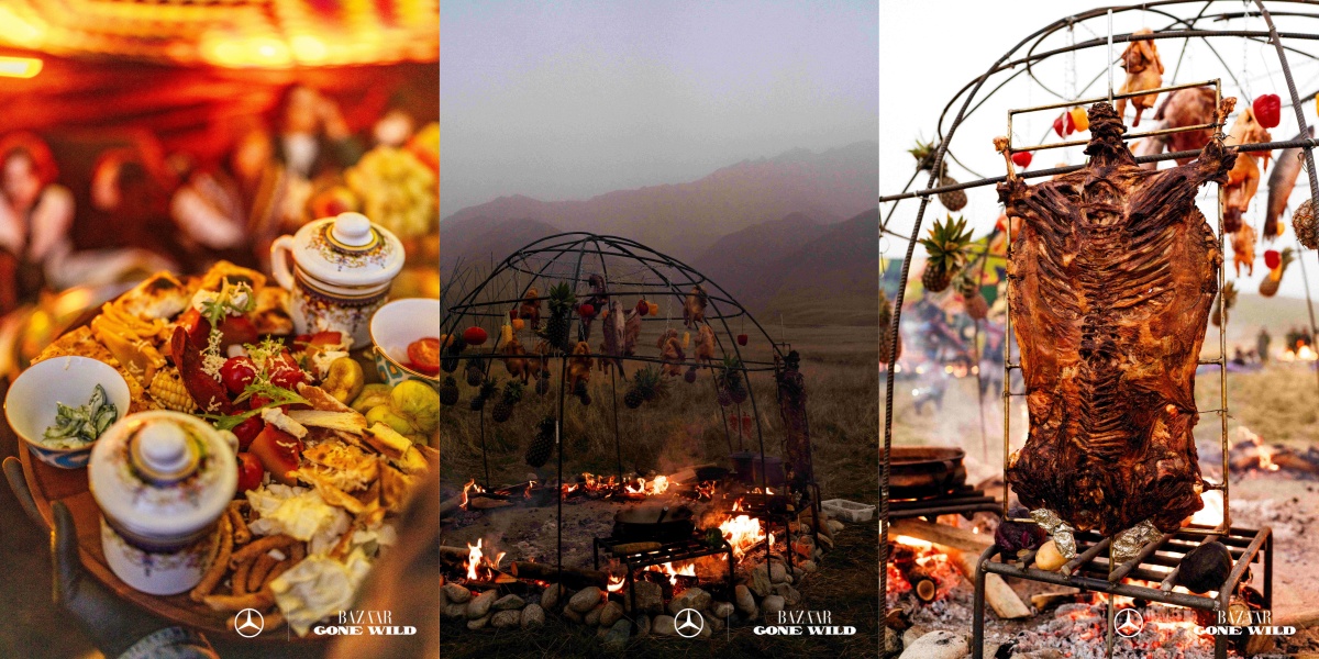 空气中传来晚宴合作伙伴Gogaga炙烤美食的芬芳,香料包裹鲜嫩的野炙全羊,原始野性的滋味与味蕾紧紧相拥。新鲜的蔬果与奶酪,源自高山草地的慷慨馈赠,组成绚烂的五彩拼盘,象征无垠疆野的四季轮回。