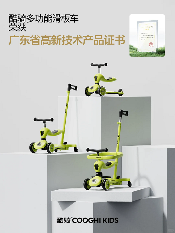 酷骑作为多功能滑板车品类的开创者,不仅获得沙利文国际权威机构认证,还参与制定了儿童骑行用品国家品质标准,获得中检集团认证的塑胶玩具领跑者荣誉称号。