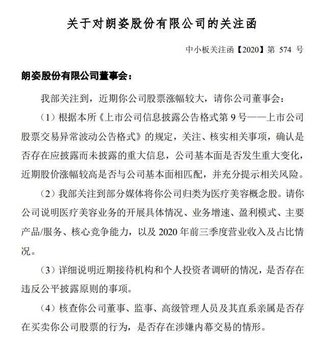 11日晚,朗姿股份收到深交所关注函,深交所指出,根据本所《上市公司信息披露公告格式第9号——上市公司股票交易异常波动公告格式》的规定,关注、核实相关事项,确认是否存在应披露而未披露的重大信息,朗姿股份基本面是否发生重大变化,近期股价涨幅较高是否与公司基本面相匹配,并充分提示相关风险。