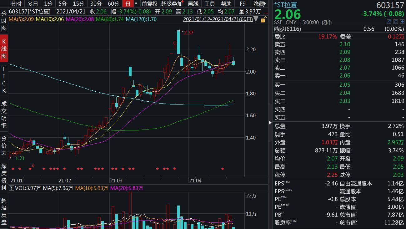 4月15日晚,*ST拉夏发布业绩快报,2020年实现营业总收入18.19亿元,同比减少76.27%;归属于上市公司股东的净亏损13.48亿元;基本每股亏损2.48元。需要一提的是,如按截至2021年4月21日收盘计算,公司2020年净亏损已超其总市值。