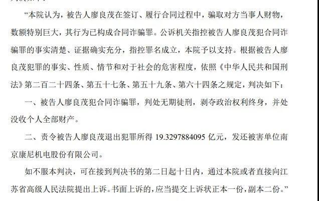 近日,A股上市公司南京康尼机电股份有限公司(以下简称“康尼机电”)发布公告称,公司原收购子公司广东龙昕科技有限公司(下称“龙昕科技”)原法定代表人廖良茂,因合同诈骗罪一审被判处无期徒刑,剥夺政治权利终身,并处没收个人全部财产。此外,法院责令廖良茂将犯罪所得的19.33亿元犯罪所得退还给康尼机电公司。