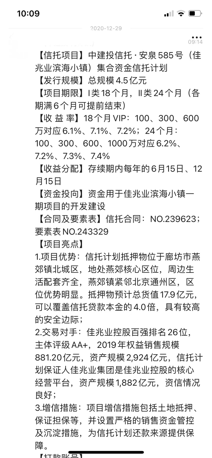 标的项目之外,抵押项目的销售回款显得格外重要。有中建投信托理财经理对记者表示,安泉585号发行时最大的亮点是抵押项目,因为抵押地块在燕郊,恰逢疫情之后燕郊楼市迎来一波反弹,因为“项目好、收益高”卖得非常火爆,需要高净值VIP摇号才能抢到,对能卖这款产品的理财经理也有一定要求。理财经理当初发给投资人的推介信息中提到,安泉585号抵押物望京苑项目位于廊坊市燕郊镇北城区,区位优势明显,预计总货值17.9亿元,可覆盖信托贷款本金的4倍,“具有较高的安全边际”。