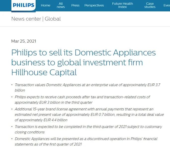 3月25日,国际消费电子巨头飞利浦集团宣布,已签署一项协议将其家用电器业务出售给高瓴资本,交易价值约为37亿欧元,交易预计将在2021年第三季度完成。