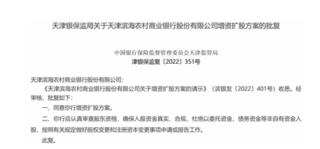 12月23日,天津银保监局发布批复显示,同意天津滨海农商银行增资扩股方案,要求该行认真审查股东资格,确保入股资金真实、合规,杜绝以委托资金、债务资金等非自有资金入股,按照有关规定做好股权变更和注册资本变更事项申请或报告工作。