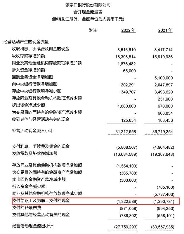 2022年,张家口银行支付给职工以及为职工支付的现金为13.23亿元,上年同期为12.91亿元。