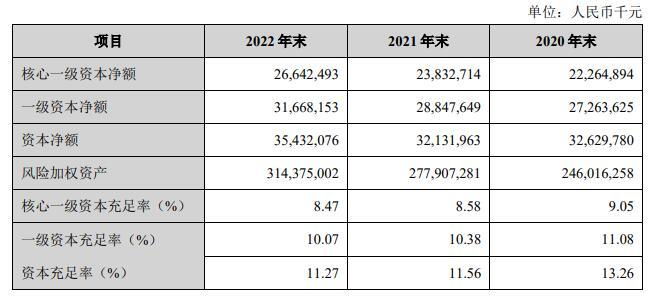 2022年末,兰州银行资本充足率为11.27%,上年末为11.56%;一级资本充足率为10.07%,上年末为10.38%;核心一级资本充足率为8.47%,上年末为8.58%。