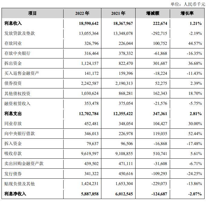 2022年,兰州银行实现利息净收入58.88亿元,较上年同期减少1.25亿元,减幅2.07%,利息净收入占营业收入的79.03%。