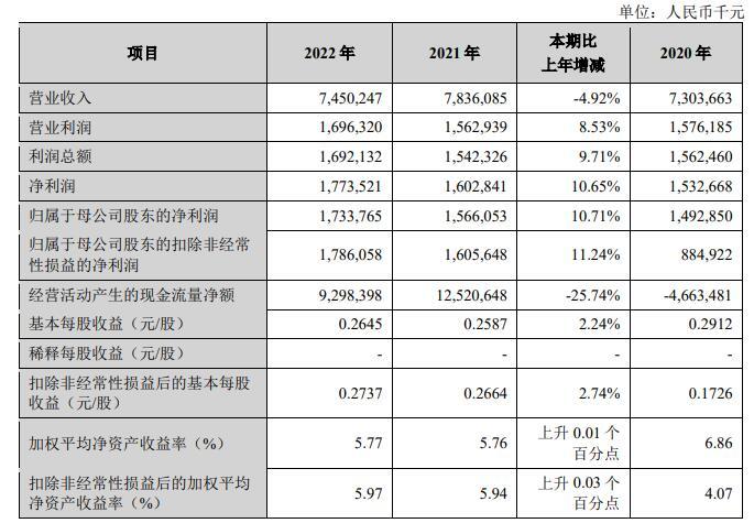 2022年,兰州银行基本每股收益0.2645元/股,同比增长2.24%;扣除非经常性损益后的基本每股收益0.2737元/股,同比增长2.74%;加权平均净资产收益率5.77%,同比上升0.01个百分点;扣除非经常性损益后的加权平均净资产收益率5.97%,同比上升0.03个百分点。