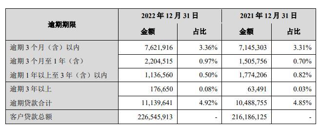 年报指出,截至2022年末,兰州银行逾期贷款111.39亿元,逾期贷款占全部贷款比例为4.92%。从逾期期限来看,主要为逾期3个月(含)以内的贷款,余额分别为76.22亿元,占全部贷款的比例为3.36%。