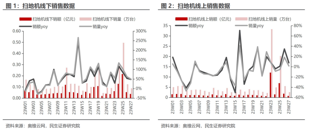 民生证券研究院援引奥维云网数据分析显示,2023年第27周,扫地机器人线上线下依然保持正向增长趋势。