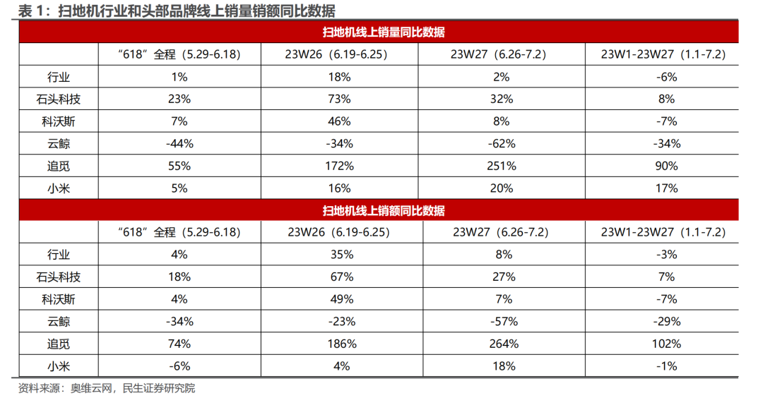 2023年7月10日,民生证券研究院发布研究报告《扫地机线上增速放缓,石头科技及追觅表现亮眼》,报告显示扫地机器人线上线下依然保持正向增长趋势,追觅扫地机器人上半年销额增长超100%,头部品牌中行业第一。
