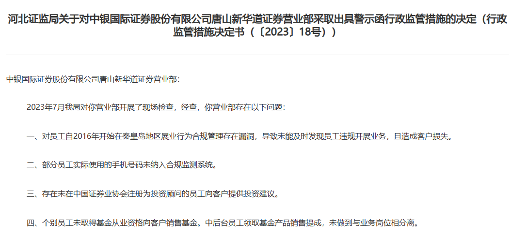 8月18日,河北证监局对中银证券开出三张罚单,直指中银证券唐山新华道证券营业部四大合规问题。
