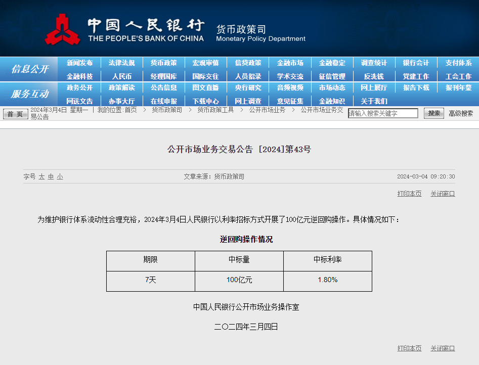 据中国人民银行官网消息,为维护银行体系流动性合理充裕,人民银行今日以利率招标方式开展了100亿元逆回购操作,中标利率1.8%。