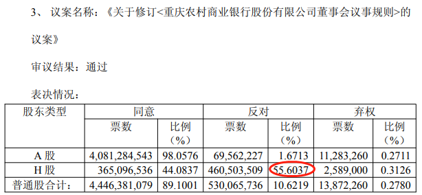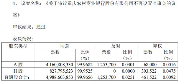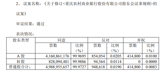 《关于修订<重庆农村商业银行股份有限公司股东会议事规则>的议案》和《关于审议重庆农村商业银行股份有限公司不再设置监事会的议案》H股股东反对票数分别仅94,564股、0票,反对比例分别为0.0114%、0.0000%。