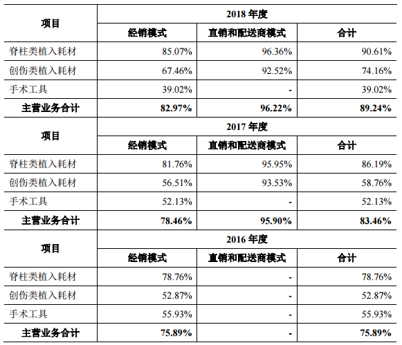 据了解,2017年部分地区开始实施医疗器械两票制后,三友医疗在陕西、广东、安徽等地开始向医院或配送商直接销售,该销售价格高于对经销商的销售价格。2017年、2018年,公司直销和配送商模式销售收入分别为3696.20万元、1.04亿元。以近两年脊柱类植入耗材产品为例,经销模式下产品毛利率分别为81.86%、85.07%,直销和配送商模式下的毛利率为95.95%、96.36%。