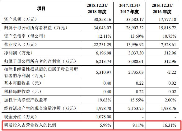 与业绩翻倍增长不同的是,三友医疗的研发费用增幅较少,研发费用率则逐年下降。报告期内,三友医疗的研发投入分别为1228万元、1276万元和1331万元,研发费用占营业收入的比重分别为16.31%、9.11%和5.99%,而同行业可比上市公司均值为7.21%、7.57%和6.94%。