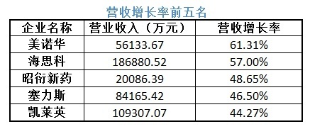 同花顺数据显示,37家企业中,营收增长率最高的是从事原料药及医药中间体、制剂研发生产的美诺华,报告期内实现营收5.61亿元,同比增长61.31%;归母净利润为8629.42万元,同比增长91.57%。