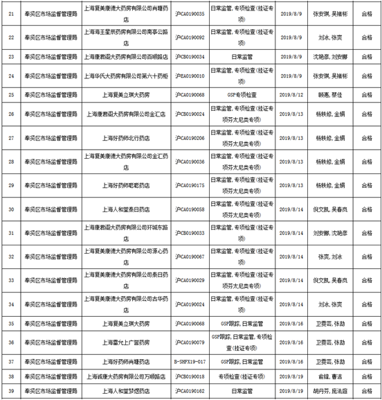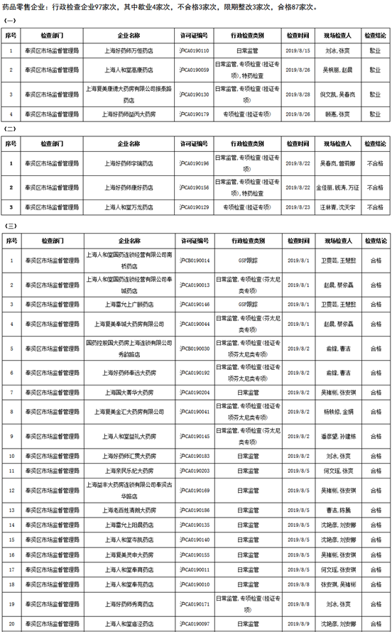 日前,上海市奉贤区市场监督管理局发布通告称,于2019年8月期间对区域内97家次药品经营企业实施了行政检查,其中合格药品零售企业87家次;不合格3家次,包括好药师两家药店上海好药师宇瑞药店、上海好药师康好药店。