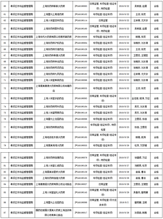 通告显示,奉贤区市场监督管理局在2019年8月6日,对上海好药师宇瑞药店(许可证编号:沪CA0190196)、上海好药师康好药店(许可证编号:沪CA0190156)实施了行政检查,检查类别为“日常监管,专项检查(挂证专项),特药检查”,检查结论为“不合格”。