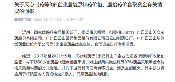 通报称,近期,国家医保局会同相关部门,根据相关线索,指导相关省对广州白云山天心制药股份有限公司、广州白云山医药集团股份有限公司白云山制药总厂、广州白云山敬修堂药业股份有限公司等3家企业药品虚高定价、套取资金进行专项调查。