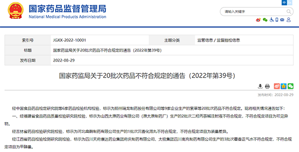 8月29日,国家药监局发布“关于20批次药品不符合规定的通告”,其中包括太极集团四川南充制药有限公司生产的3批次藿香正气水不符合规定,不符合规定项目为甲醇量。