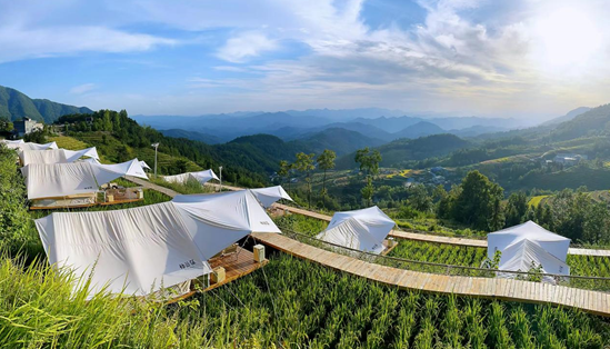 (建行挂职陕西安康汉阴帮扶干部将现代时尚的露营生活方式引入传统乡村,使知名帐篷营地品牌落地汉阴凤堰古梯田,创新乡村文旅模式,为乡村振兴注入共富活力。)