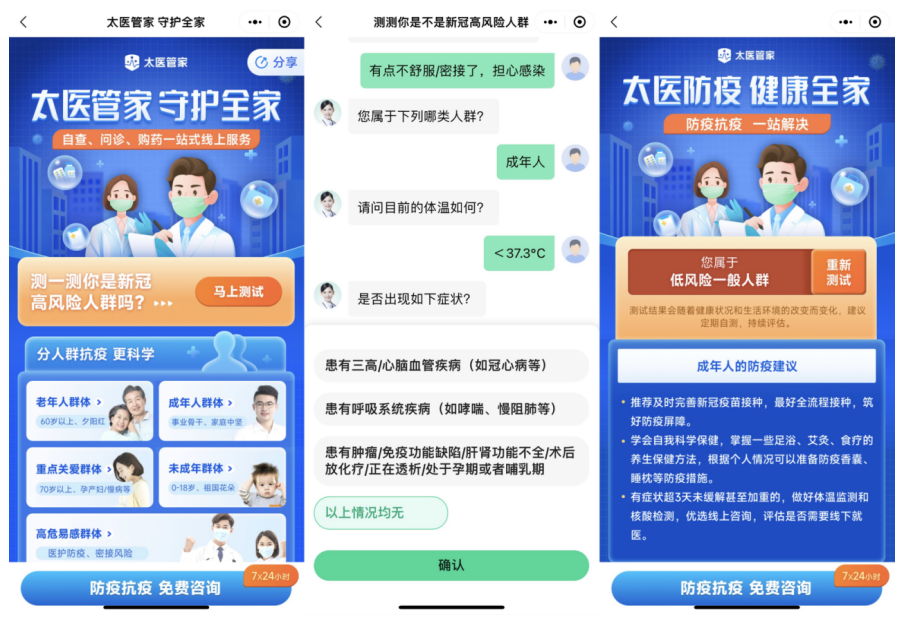 为适应疫情防控新形势和新冠病毒变异的新特点,近日,中国太保旗下太医管家上线了以“太医管家 守护全家”为主题的一站式抗疫服务专区。其中包含太医管家自主开发的风险预估和个性化抗疫方案自测工具、7*24小时线上医生免费咨询服务、抗疫物资采购通道及抗疫知识专区,助力用户实现有效健康防护,做好自己健康的第一责任人。