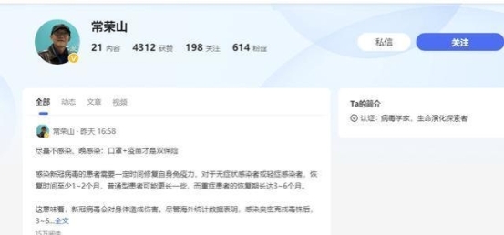 至于“病毒学家常荣山”自己也开了账号,名字就叫常荣山,认证为“病毒学家,生命演化探索者”。并没有注明工作单位及其它能证实其能成为病毒学家的内容。