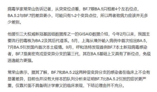 比如界面新闻在12月13日就引用了病毒学家常荣山关于BF.7跟BA.5突变位点位的观点;12月 15日,每日经济新闻引用了常荣山关于新冠的观点,他说:“通常情况下新冠肺炎属于自限性疾病,即病情具有自我缓解特点,能够自行消散,99%以上的18岁至55岁人群无需服用新冠特效药即可康复”。